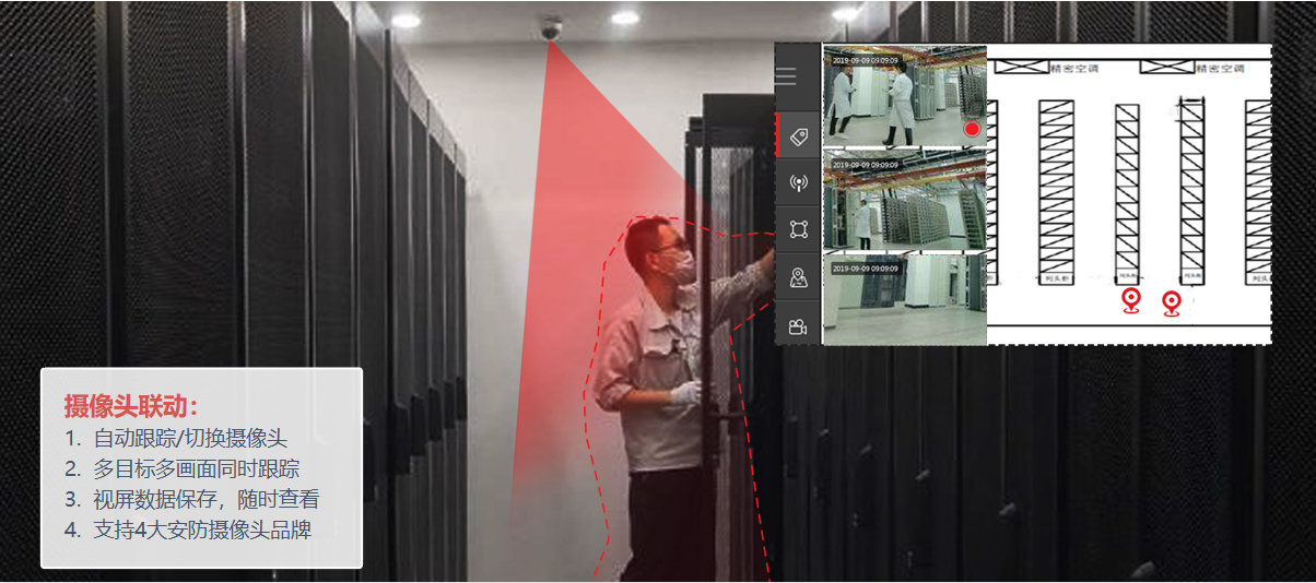面對行業(yè)的需求大背景,全跡提出更具針對性的數(shù)據(jù)機房定位系統(tǒng),通過在區(qū)域內(nèi)布設有限數(shù)量全跡UbiTraq基站,實時精確地定位人員、資產(chǎn)上的標簽位置,即時將人、物的位置信息顯示在機房控制中心,進行安全區(qū)域管控、人員在崗監(jiān)控、歷史移動軌跡查詢、電子圍欄、SOS一鍵報警等。