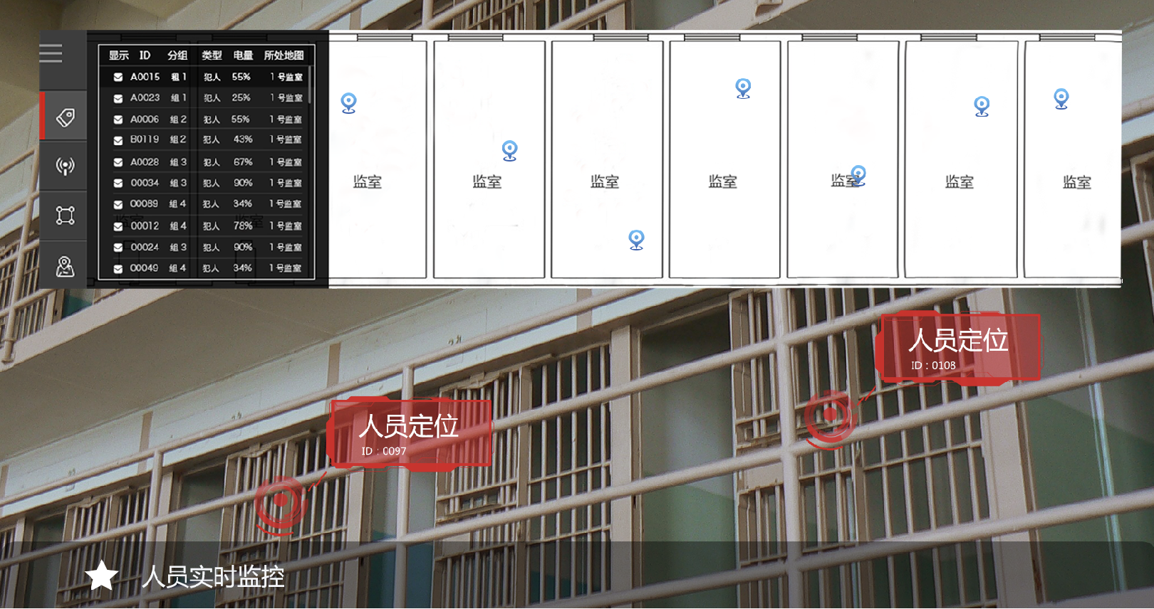 全跡科技監獄高精度定位管理系統使用UWB室內定位技術,通過在監所區域安裝定位基站,為犯人和獄警佩戴定位標簽的形式,實現人員精準實時定位。能夠隨時掌握人員在監所中的位置、活動軌跡以及監所各區域人員分布情況等,系統后臺可以設置禁區入侵、脫離監管報警等并有視頻聯動功能,便被動監管為主動監管。系統支持全天候動態點名,對犯人進行24小時位置監控和軌跡跟蹤,使監獄管理工作更加智能化。
