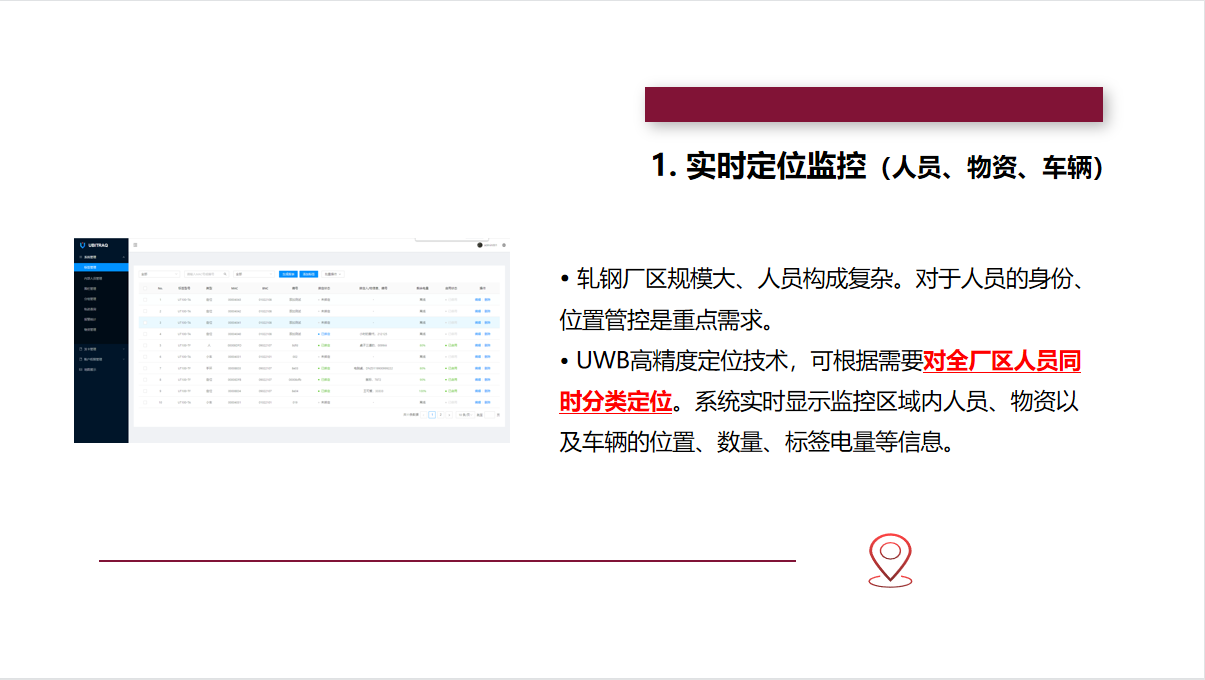 全跡科技UbiTraq冶金鋼鐵高精度定位系統(tǒng),通過在廠區(qū)內(nèi)布設(shè)規(guī)定數(shù)量的UWB定位基站,實時精確地對人員、車輛、資產(chǎn)上的標(biāo)簽進行定位,并將位置信息顯示在廠區(qū)的控制中心,進行安全區(qū)域管控、人員在崗監(jiān)控等,最大限度地避免事故的發(fā)生,助力冶金鋼鐵企業(yè)實現(xiàn)智慧化的安全運營管理。